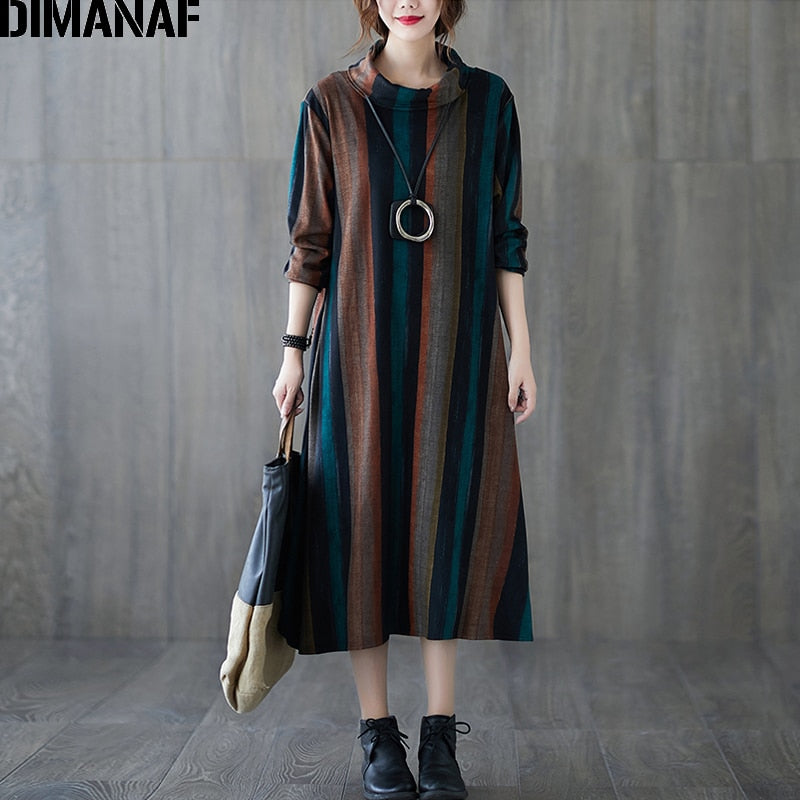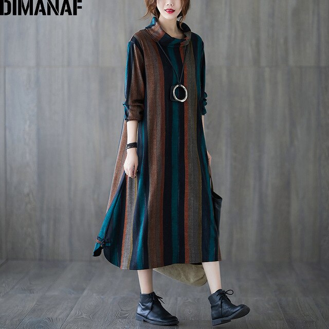 Brand Name: DIMANAFMaterial: CottonSilhouette: A-LineAge: Ages 35-45 Years OldModel Number: Women DressSeason: WinterNeckline: TurtleneckSleeve Length(cm): FullSleeve Style: RegularGender: WOMENDecoration: PocketsStyle: vintageWaistline: NaturalPattern Type: stripedDresses Length: Mid-CalfSeason: New WinterSize: Oversized,Plus Size,Loose,Big, Large,WideStyle: Casual,Elegant Lady,Vintage
