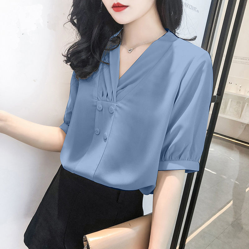 Brand Name: RibbonFishMaterial: PolyesterClothing Length: RegularAge: Ages 18-35 Years OldCollar: V-NeckDecoration: ButtonSleeve Length(cm): ShortSleeve Style: RegularStyle: CasualFabric Type: ChiffonPattern Type: SolidModel Number: DF3543